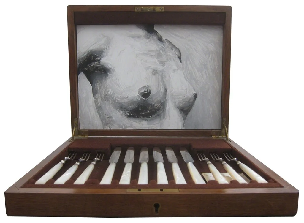 Antique knife box with acrylic painting, 9 x 11.5 x 2 in